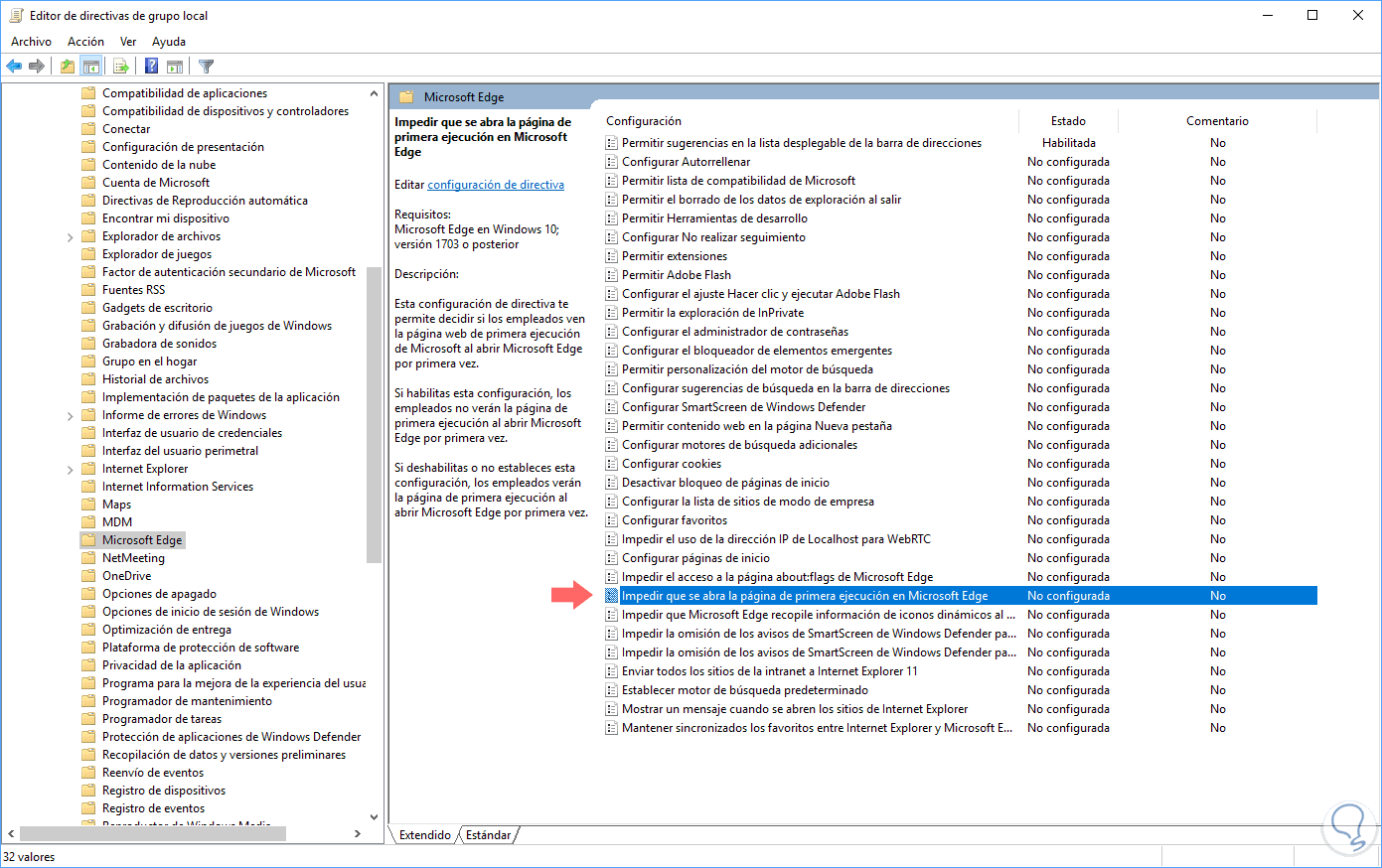Configuración del equipo / Plantillas administrativas / Componentes de Windows / Microsoft EdgeEn esta ruta ubicaremos en el panel derecho la política llamada “Impedir que se abra la página de primera ejecución en Microsoft Edge”