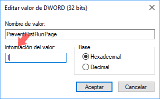 Editaremos este valor dando doble clic o clic derecho / Modificar y en el campo Información del valor establecemos el número uno (1). Pulsamos en Aceptar y podremos cerrar el editor de registros.