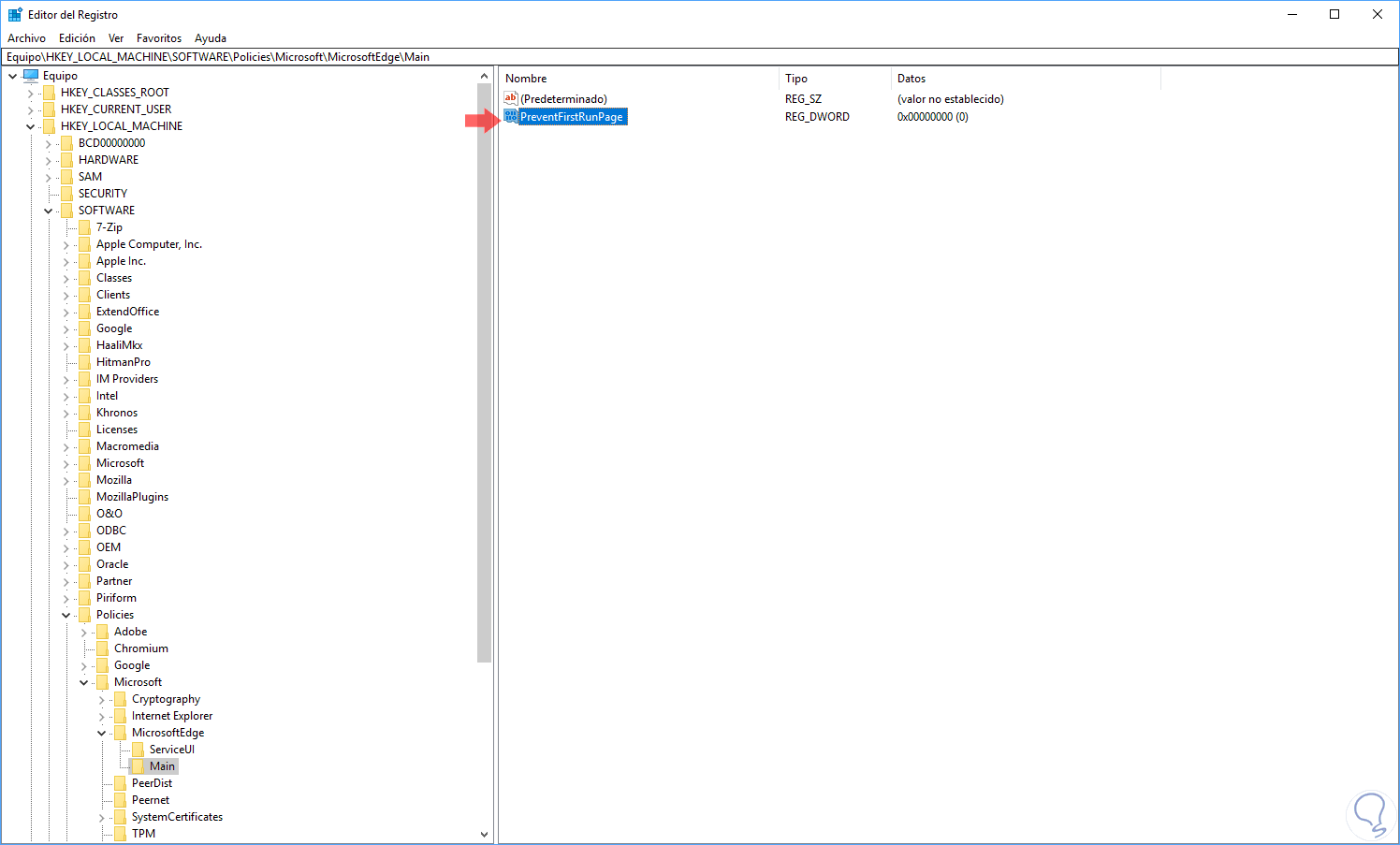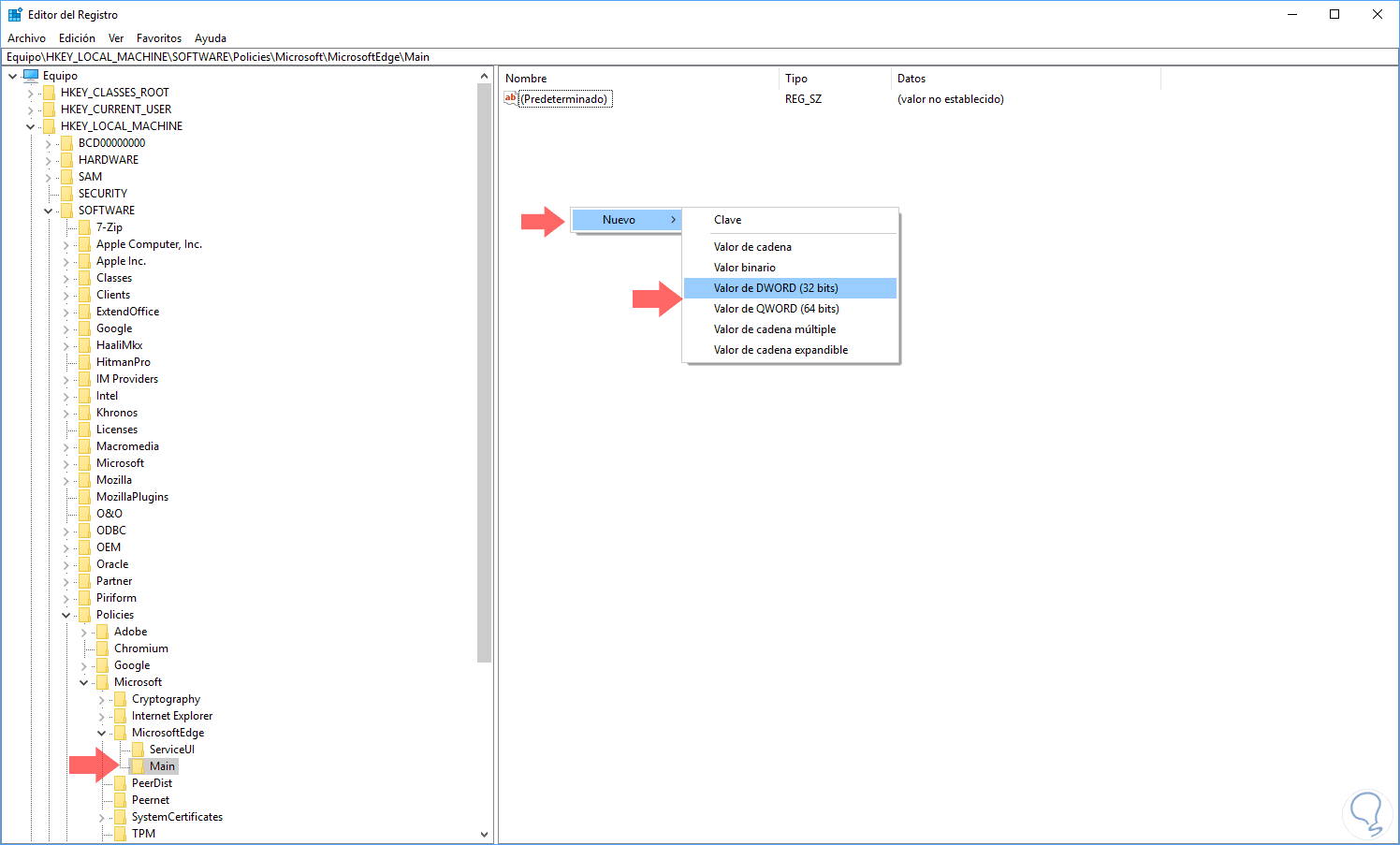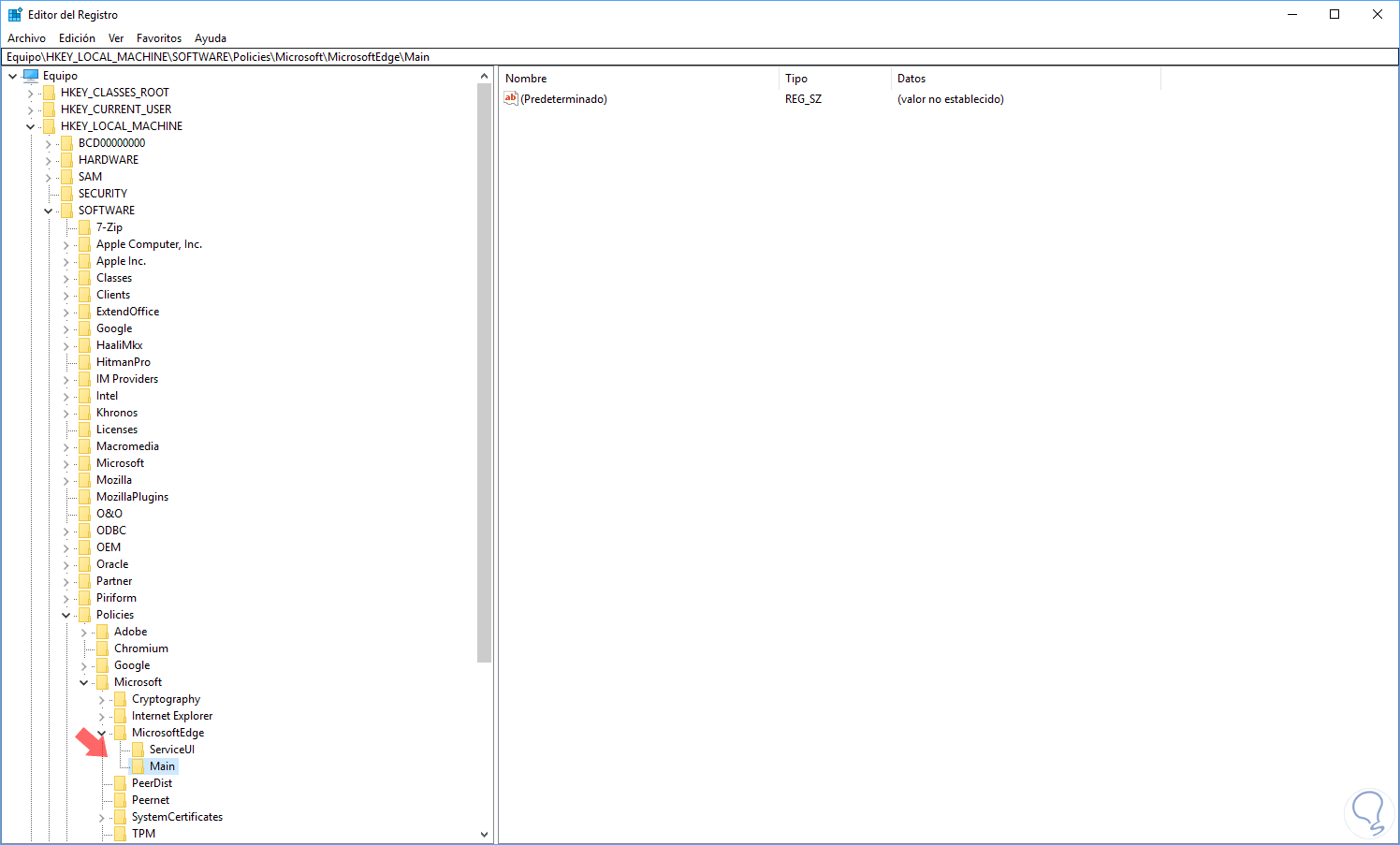 Ahora repetimos el proceso de creación de clave para establecer una nueva clave dentro de MicrosoftEdge, la cual se llamará Main: