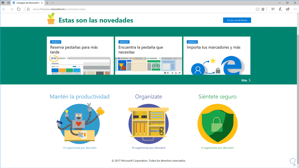 En esta encontramos todas las novedades de Microsoft Edge así como enlaces a las utilidades más prácticas de este: