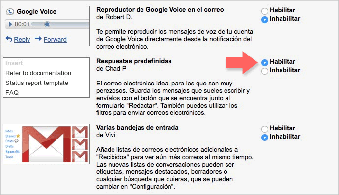 Una vez aquí, accedemos a la pestaña Labs donde vamos a buscar la opción de Respuesta estándar entre las opciones que ofrece. Marcamos la opción Habilitar y guardamos los cambios: