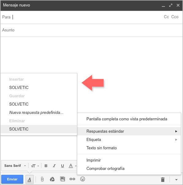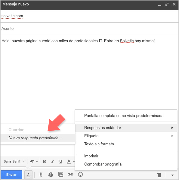 Ahora si queremos comenzar a utilizar esta respuesta, tenemos abrir un nuevo mensaje y seleccionar de nuevo el menú desplegable situado en la parte inferior. Veremos que si seleccionamos la opción de "Respuesta estándar". Desde ahí vamos a poder incluir nuestra respuesta, guardarla o eliminarla según nos interese.