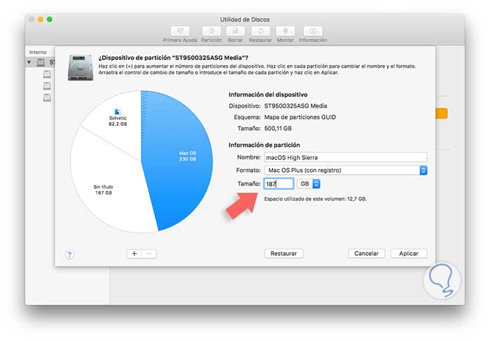 Allí asignaremos un nombre a dicha partición, en este caso la hemos llamado macOS High Sierra, seleccionamos el formato de archivos Mac OS Plus (con registro) y establecemos el tamaño bien sea ingresando el valor directamente en el campo Tamaño o bien usando el deslizador en el gráfico de discos: