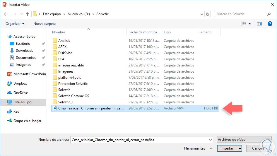 La primer opción a analizar es la forma de añadir un video a PowerPoint almacenado de forma local en el equipo.