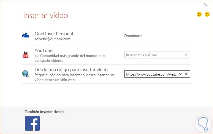 Sera desplegada la siguiente ventana donde podremos seleccionar alguna de las opciones disponibles, en este caso hemos añadido la dirección de inserción del video de YouTube: