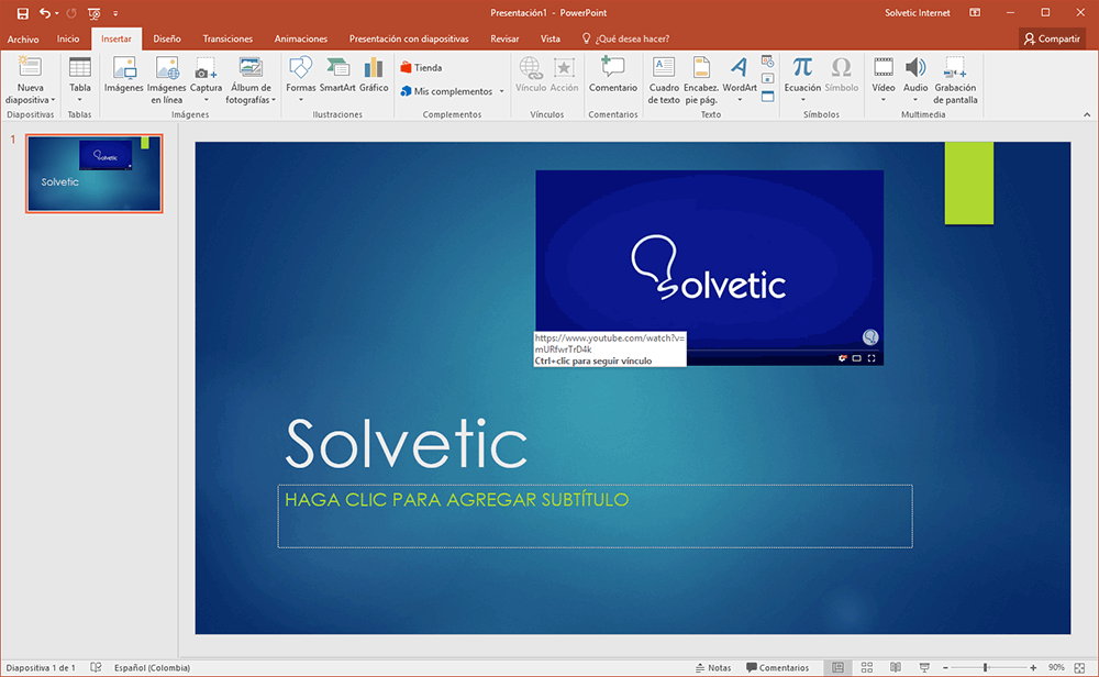 Otra de las opciones brindadas por PowerPoint 2016 es añadir un link el cual, al ser pulsado, nos redireccionara al video.