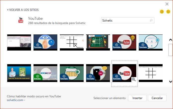 En el caso de seleccionar la opción YouTube basta con ingresar el termino de búsqueda y serán desplegados todos los resultados asociados a dicho termino. Basta con seleccionar el video y dar clic en Insertar.