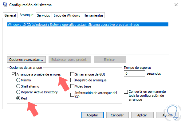 Al pulsar Aceptar será desplegada la siguiente ventana donde nos dirigiremos a la pestaña "Arranque" y allí activaremos la casilla "Arranque a prueba de errores" y en las opciones disponibles activamos la casilla Red. Pulsamos en Aplicar y Aceptar para guardar los cambios y reiniciar el sistema operativo.
