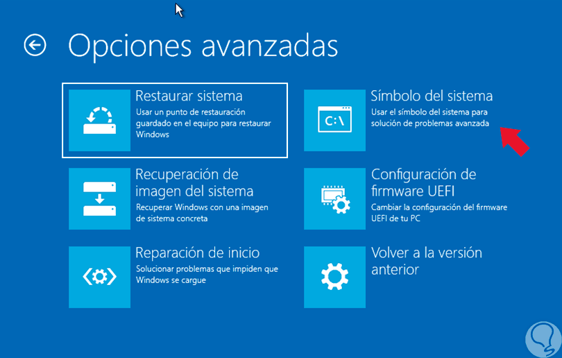 La siguiente opción que nos ofrece Windows 10 es usar la opción de reinicio avanzado para la cual tenemos las siguientes opciones: