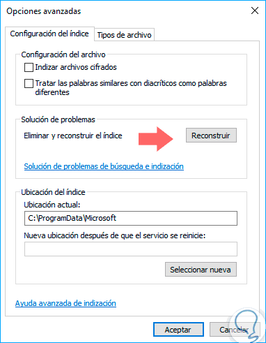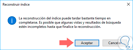 Allí pulsaremos en el botón "Reconstruir" ubicado en el campo "Solución de problemas" con el fin de reconstruir el índice con los nuevos cambios aplicados. Al pulsar allí será desplegada la siguiente ventana. Pulsamos en Aceptar para aplicar los cambios.