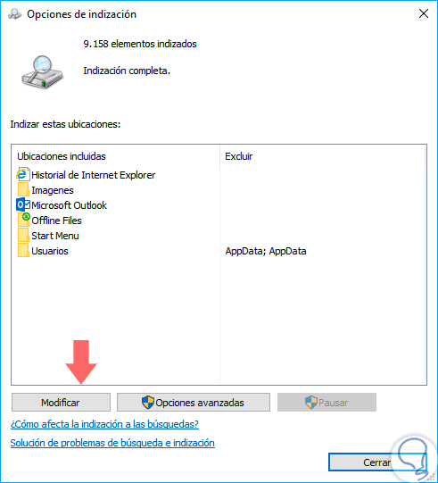 Sera necesario que accedamos a la configuración de indización para que dichos elementos no sean desplegados en la búsqueda de Windows 10.