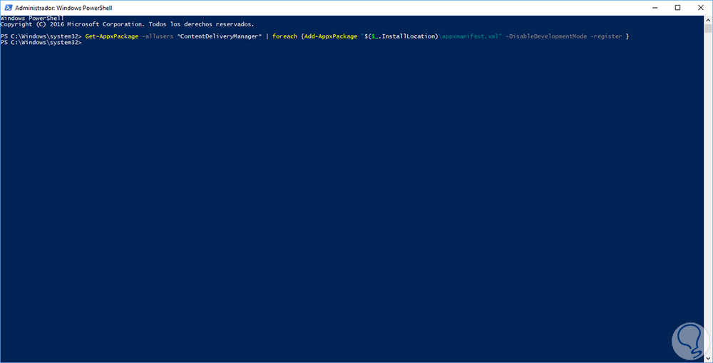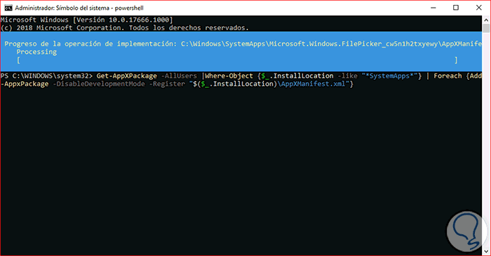 Get-AppXPackage -AllUsers |Where-Object {$_.InstallLocation -like “*SystemApps*”} | Foreach {Add-AppxPackage -DisableDevelopmentMode -Register “$($_.InstallLocation)\AppXManifest.xml”}En la pantalla de Windows 10 veremos lo siguiente:
