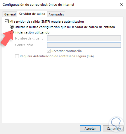 A continuación pulsamos en el botón Mas configuraciones y nos dirigimos a la pestaña Servidor de salida donde activaremos la casilla Mi servidor de salida (SMTP) requiere autenticación y dejamos la casilla Utilizar la misma configuración que mi servidor de correo de entrada:
