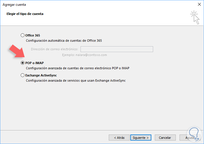 Pulsamos en Siguiente y en la próxima ventana seleccionamos la opción POP o IMAP:
