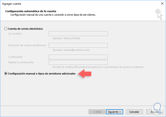 Sera desplegada la siguiente ventana donde seleccionaremos la opción Configuración manual o tipos de servidores adicionales: