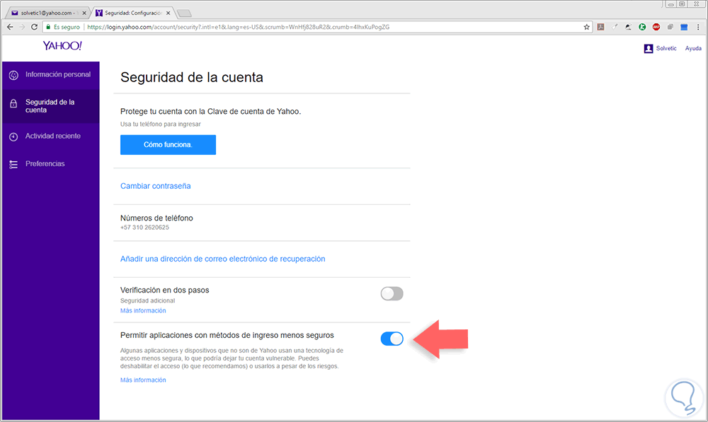 En la nueva ventana que será desplegada vamos al campo Seguridad de la cuenta y activamos el interruptor de la opción Permitir aplicaciones con métodos de ingreso menos seguros ya que por defecto se encuentra deshabilitada: