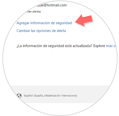 Ahora pulsamos en la opción Agregar información de seguridad y en la ventana desplegada seleccionaremos la opción. Un teléfono, código del país y el nuevo número de teléfono asociado a la cuenta de correo: