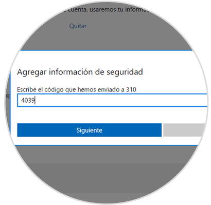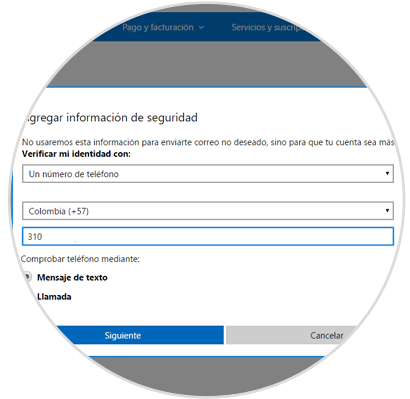 Aquí podremos seleccionar la opción de llamada o de envío de código para la confirmación del número de teléfono asociado. En este caso dejamos la opción Mensaje de texto y posteriormente será necesario que ingresemos el código que hemos recibido a través de mensaje de texto en el número asociado: