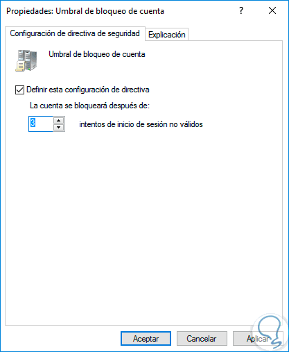 Es importante anotar que si dicho valor está en cero la cuenta no será bloqueada por lo cual esa opción no es recomendable. Allí podremos definir un valor entre 0 y 999. Esta política es la principal en esta sección ya que una vez bloqueada por intentos de sesión fallidos solo un administrador tendrá el derecho para deshabilitarla.