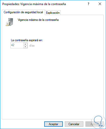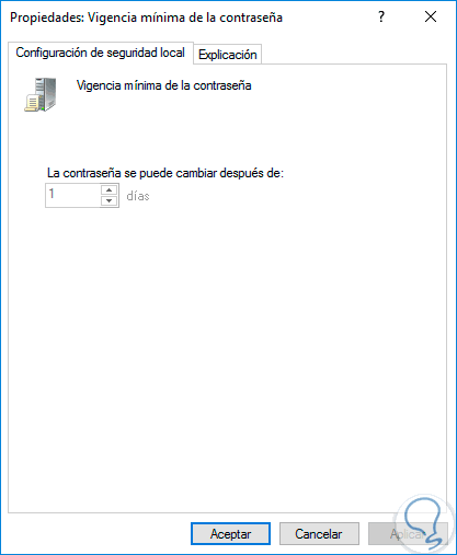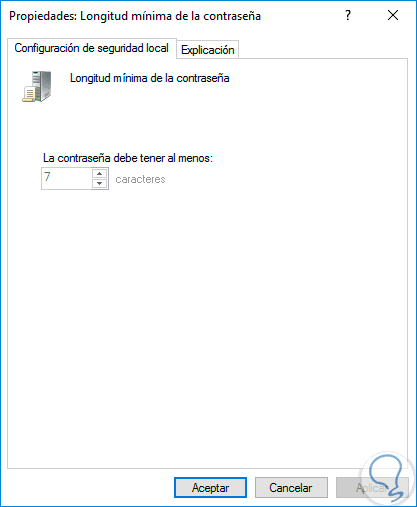 Allí podremos establecer valores entre 1 y 14 pero si dejamos el valor en 0 significa que el usuario ingresara sin contraseña. El valor por defecto en Windows Server 2016 es de 7 caracteres.