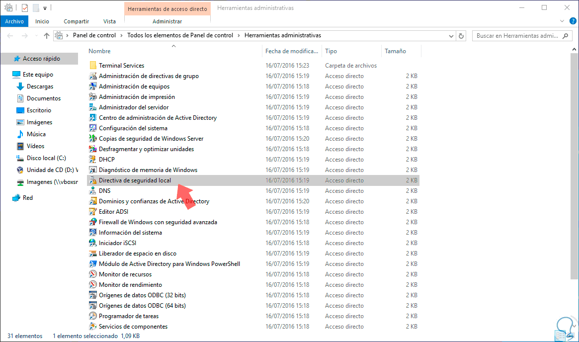 El segundo método disponible es ir a la ruta Panel de control\Todos los elementos de Panel de control\Herramientas administrativas y allí seleccionar la opción "Directiva de seguridad local".