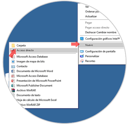 Para esto en primer lugar crearemos un nuevo acceso directo y para realizar esta tarea daremos clic derecho en cualquier espacio del escritorio y allí seleccionamos la opción Nuevo / Acceso directo: