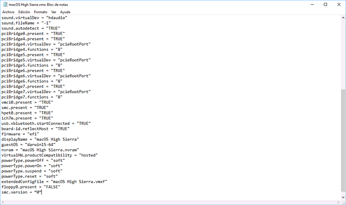 Una vez sea abierto el archivo de texto con la configuración VMX de la máquina virtual vamos al final de este y añadiremos alguna de las siguientes opciones: