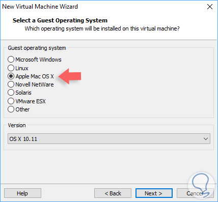 Nuevamente pulsamos en Next y en la siguiente ventana seleccionaremos Apple Mac OS X en el campo Guest operating System y OS X 10.11 en el campo Versión: