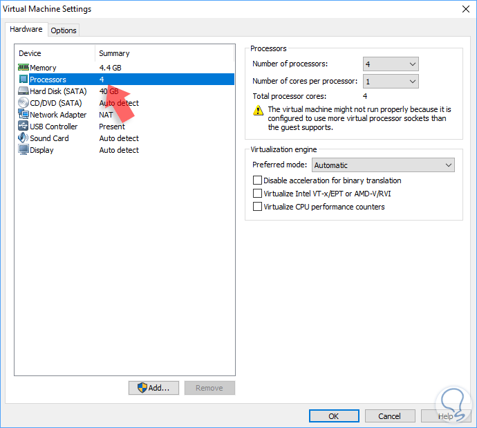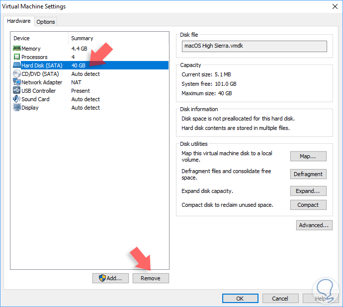 Ahora seleccionamos el campo Hard Disk y pulsamos en el botón Remove ubicado en la parte inferior: