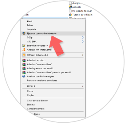 Una vez descargado y descomprimido el archivo ubicamos el archivo llamado win-install, daremos clic derecho sobre y en las opciones desplegadas seleccionamos Ejecutar como administrador: