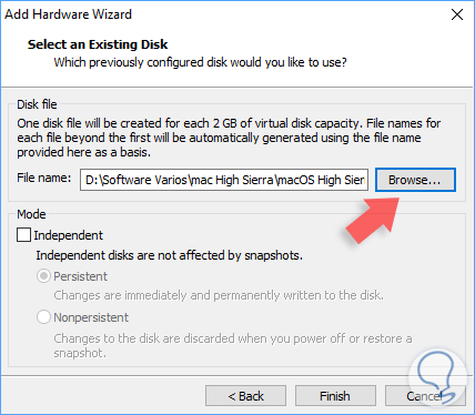 Pulsamos en Next y en la siguiente ventana pulsaremos en Browse para ubicar el disco duro virtual en el equipo local:
