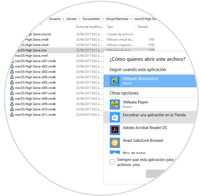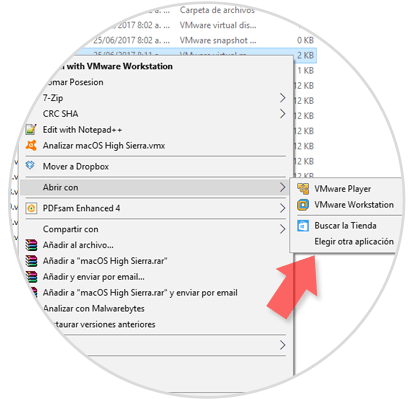 El siguiente paso consiste en editar los valores del archivo VMX creado asociado a esta máquina virtual y para ello vamos a la ruta donde se ha guardado la máquina virtual y ubicaremos el archivo .VMX sobre el cual daremos clic derecho , seleccionamos la opción Abrir con: