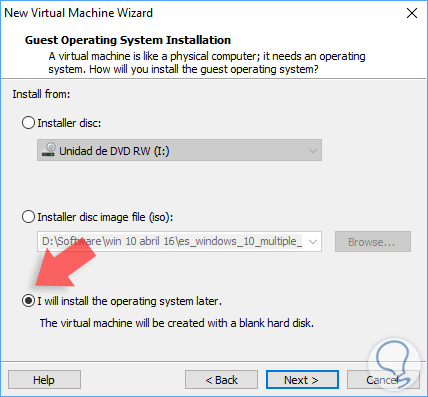 Pulsamos en Next y en la siguiente ventana seleccionaremos la opción I will install the operating system later: