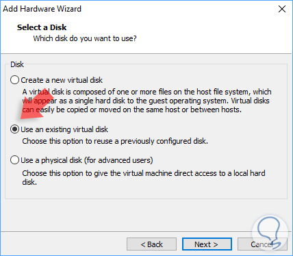 De nuevo pulsamos en Next y ahora seleccionamos la opción Use an existing virtual disk con el fin de seleccionar el disco virtual descargado: