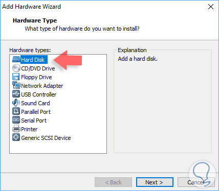 Pulsamos en el botón Add y seleccionamos Hard Disk:
