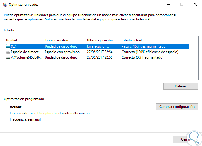 Allí seleccionamos la unidad a reducir y pulsaremos en el botón "Optimizar" y veremos que inicia el proceso de desfragmentación del disco duro: