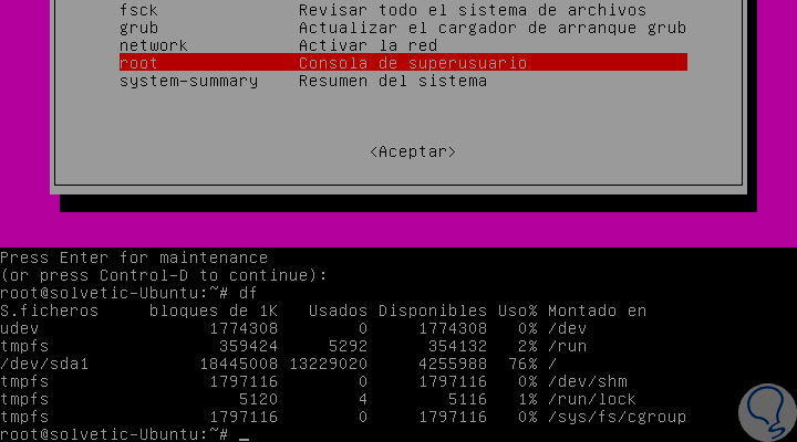 Pulsamos Enter y a continuación de nuevo pulsamos Enter para acceder al modo de mantenimiento y allí ejecutamos el comando “df”: