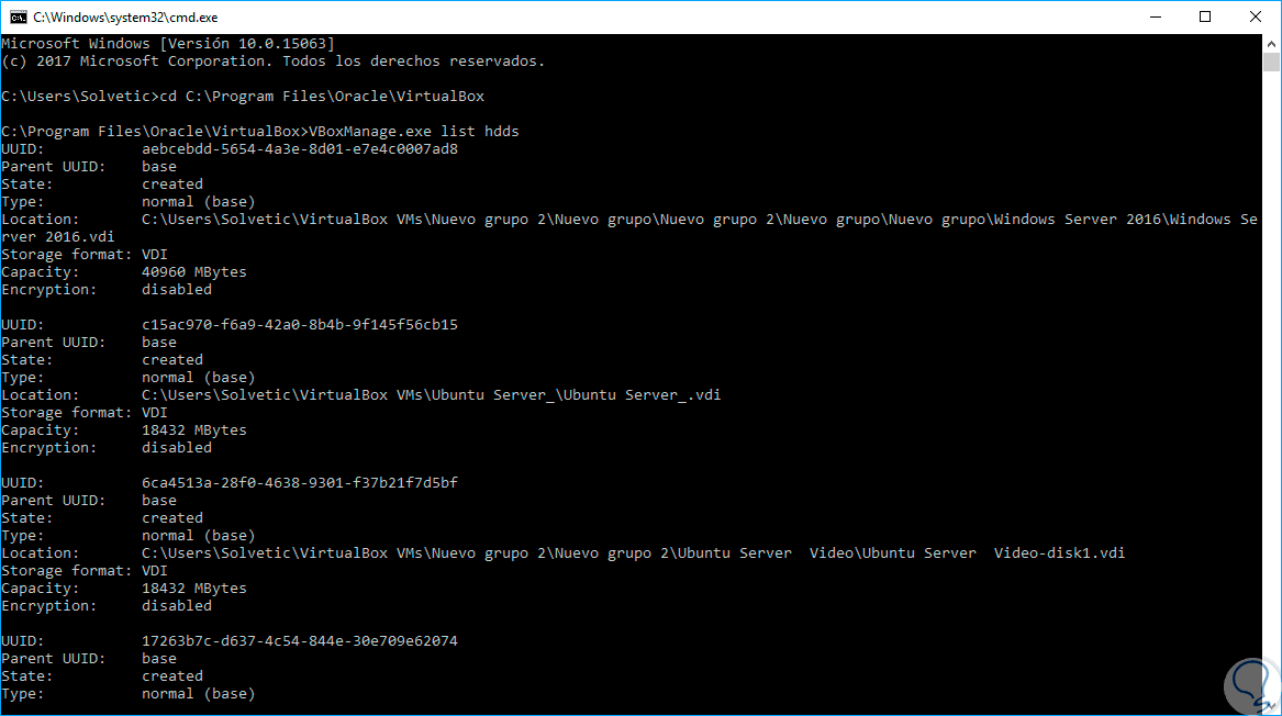 Una vez accedamos a dicho directorio ejecutaremos el siguiente comando para listar todos los discos duros virtuales asociados a VirtualBox: