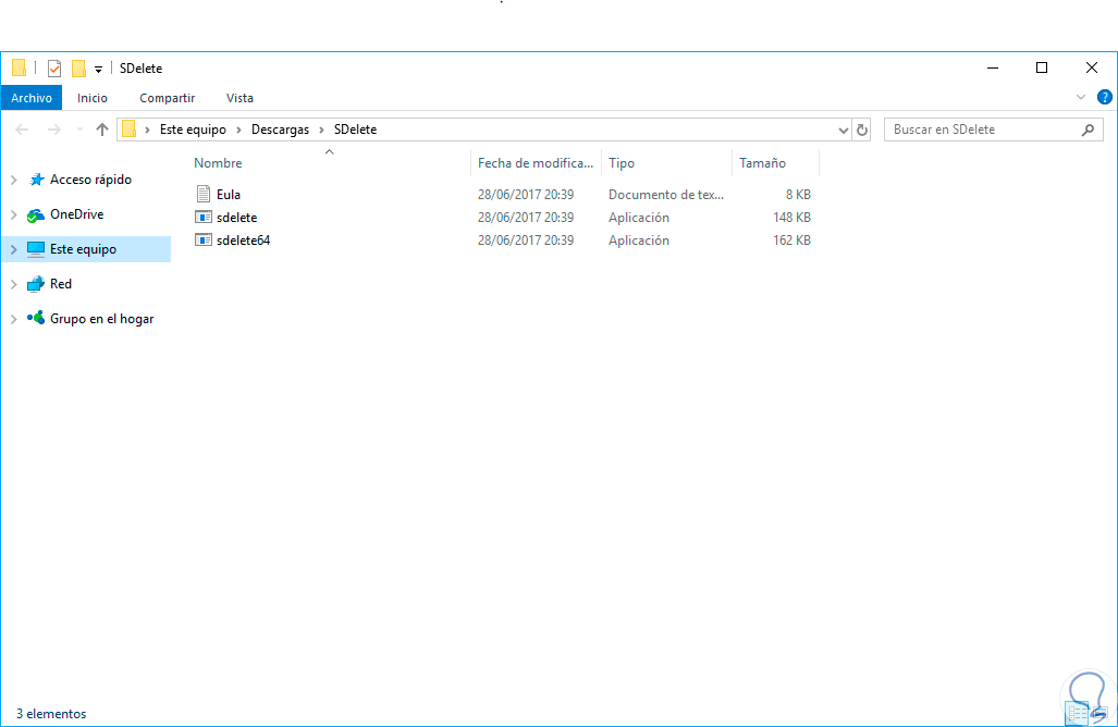 SDelete está en la capacidad de borrar permanentemente archivos individuales, directorios o múltiples objetos mediante el uso de comodines. Además de eliminar de forma segura los archivos existentes, SDelete se encarga de purgar los datos en los clústeres no asignados de un disco, es decir, los archivos que ya se han eliminado. Descargamos y extraemos el contenido del comprimido: