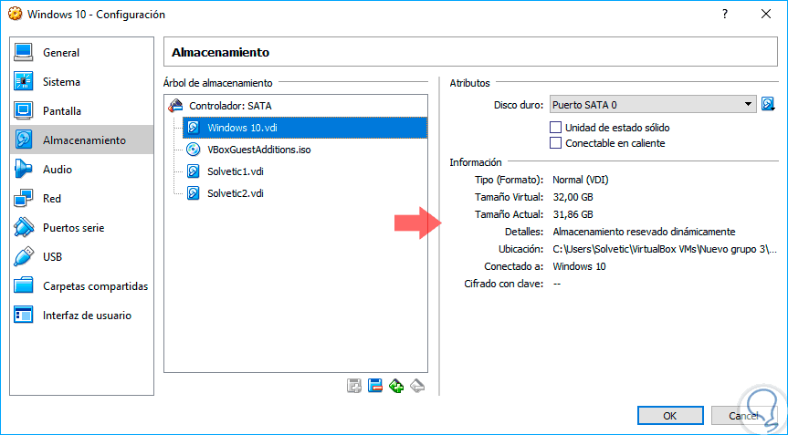 El primer paso es verificar que el disco duro virtual de la máquina seleccionada este configurado de forma dinámica ya que de lo contrario el proceso no podrá llevarse a cabo. Recordemos que un disco de tamaño fijo siempre tendrá el tamaño establecido mientras que el dinámico irá creciendo a medida que añadimos información.