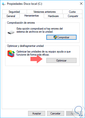 Ahora, vamos a acceder al desfragmentador del disco duro, para ello damos clic derecho sobre la unidad C, seleccionamos la opción “Propiedades” y en la pestaña “Herramientas” pulsamos en el botón “Optimizar”: