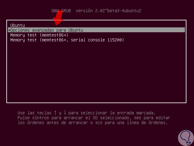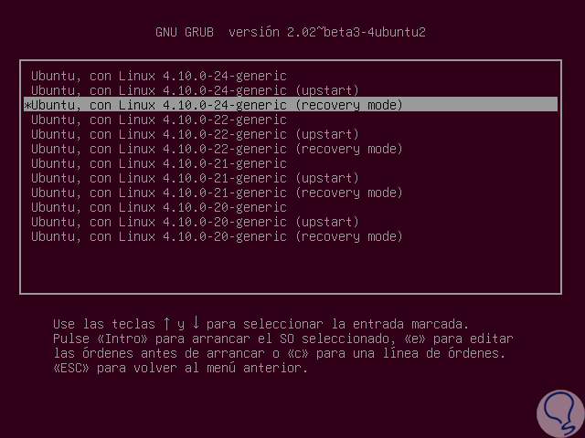 Pulsamos Enter y en la siguiente ventana seleccionamos el kernel más reciente con la leyenda “recovery mode”: