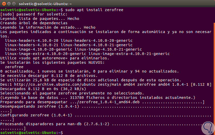 Ahora era necesario ejecutar la utilidad zerofree en dicha unidad ejecutando lo siguiente: