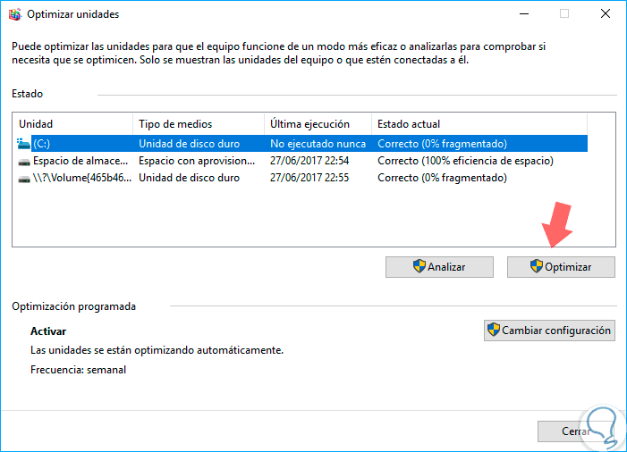 Se desplegará la siguiente ventana. Allí seleccionamos el disco C y pulsamos en el botón “Optimizar” para ejecutar el proceso.