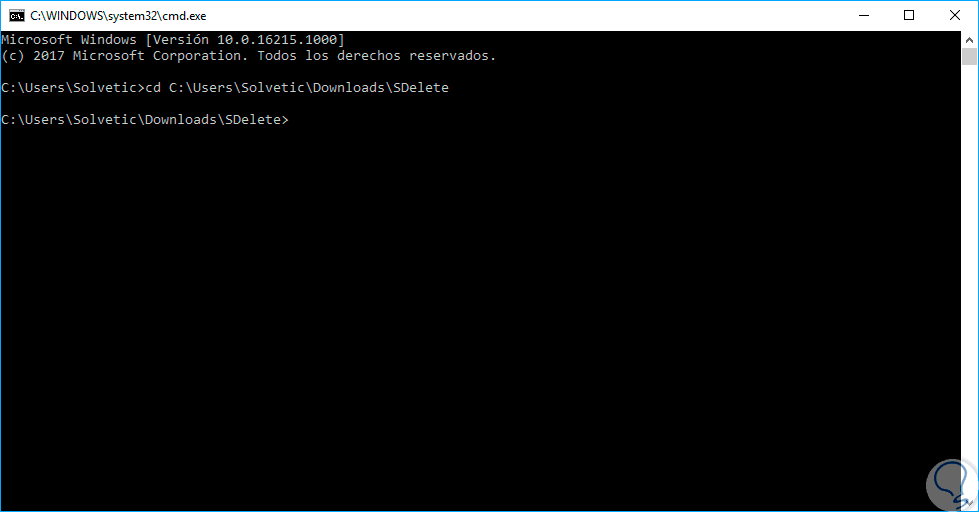 Abrimos una consola del símbolo del sistema como administradores y allí iremos, usando el comando cd, a la ruta donde se ha extraído SDelete y ejecutamos lo siguiente: