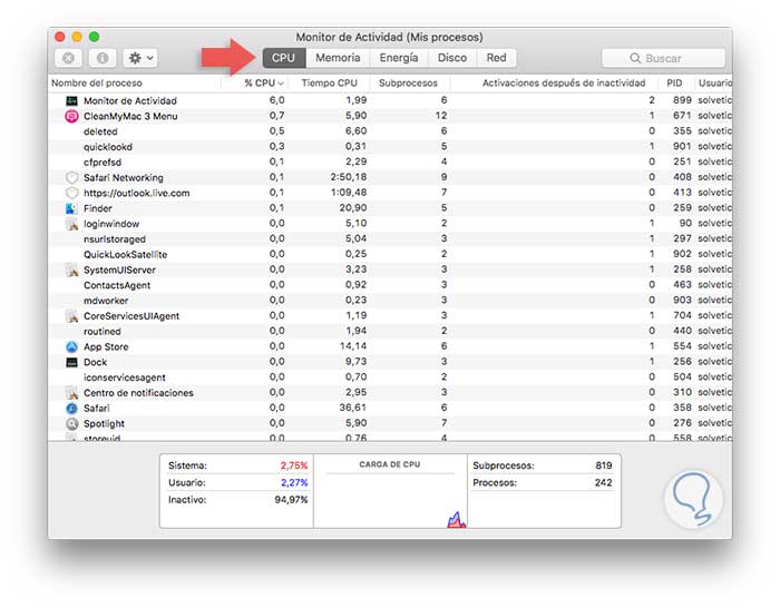 En la ventana desplegada seleccionamos la utilidad Monitor de actividad. Será desplegada la siguiente ventana donde veremos el consumo de CPU en tiempo real de cada aplicación en macOS High Sierra: