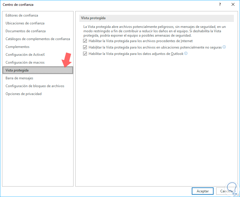 En la nueva ventana desplegada seleccionaremos la línea Vista protegida y podremos ver las respectivas opciones en el costado derecho: