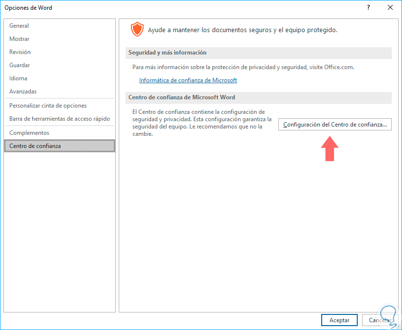 Al acceder a Opciones será desplegada la siguiente ventana donde seleccionaremos la línea Centro de confianza y en el costado derecho pulsamos en el botón Configuración del Centro de confianza: