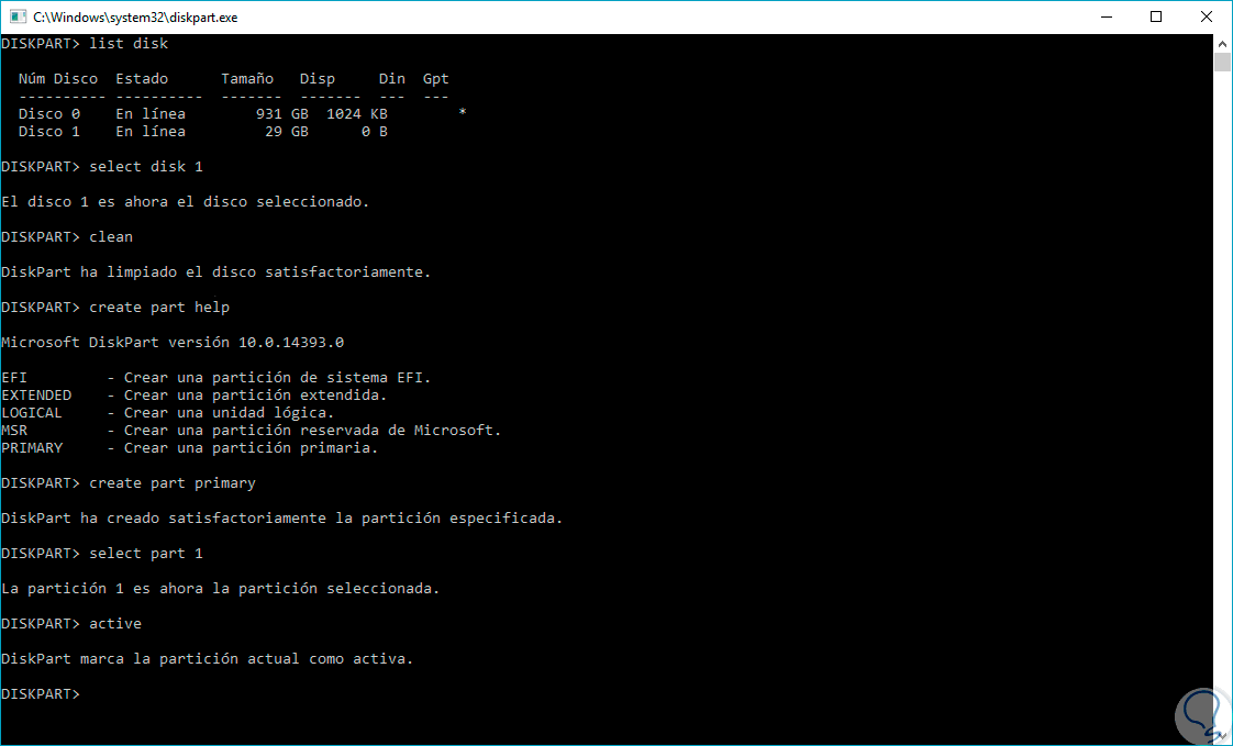 Con el siguiente comando verás el listado de discos disponibles y aquí deberás identificar qué número representa tu USB. Puedes ayudarte del tamaño para reconocerlo. En este caso el nuestro tiene 29 GB, será el disco 1.
