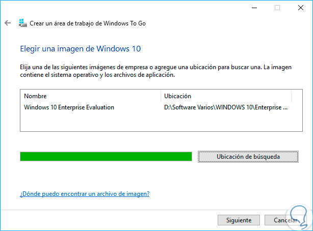Allí seleccionamos la unidad USB donde se creará Windows To Go y pulsamos Siguiente y a continuación seleccionaremos la carpeta donde se encuentra alojada la imagen de Windows: